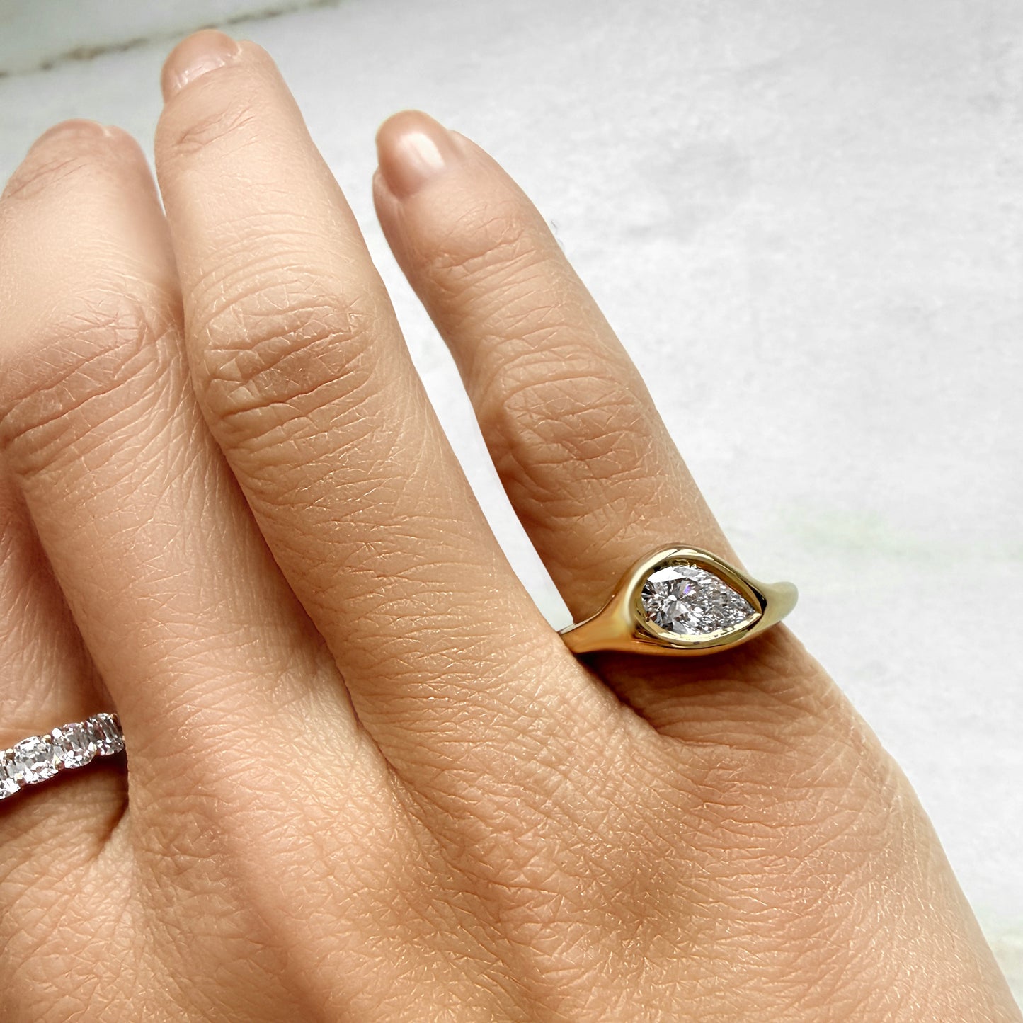 The Zaria Pinky Ring features a 1.08ct IGI certified pear-shaped lab-grown diamond in E color and VS1 clarity, set on a sculptural bubble-style gold band that adds texture and dimension. The elongated pear silhouette delivers striking brilliance while the playful band creates a modern, flattering line along the finger.