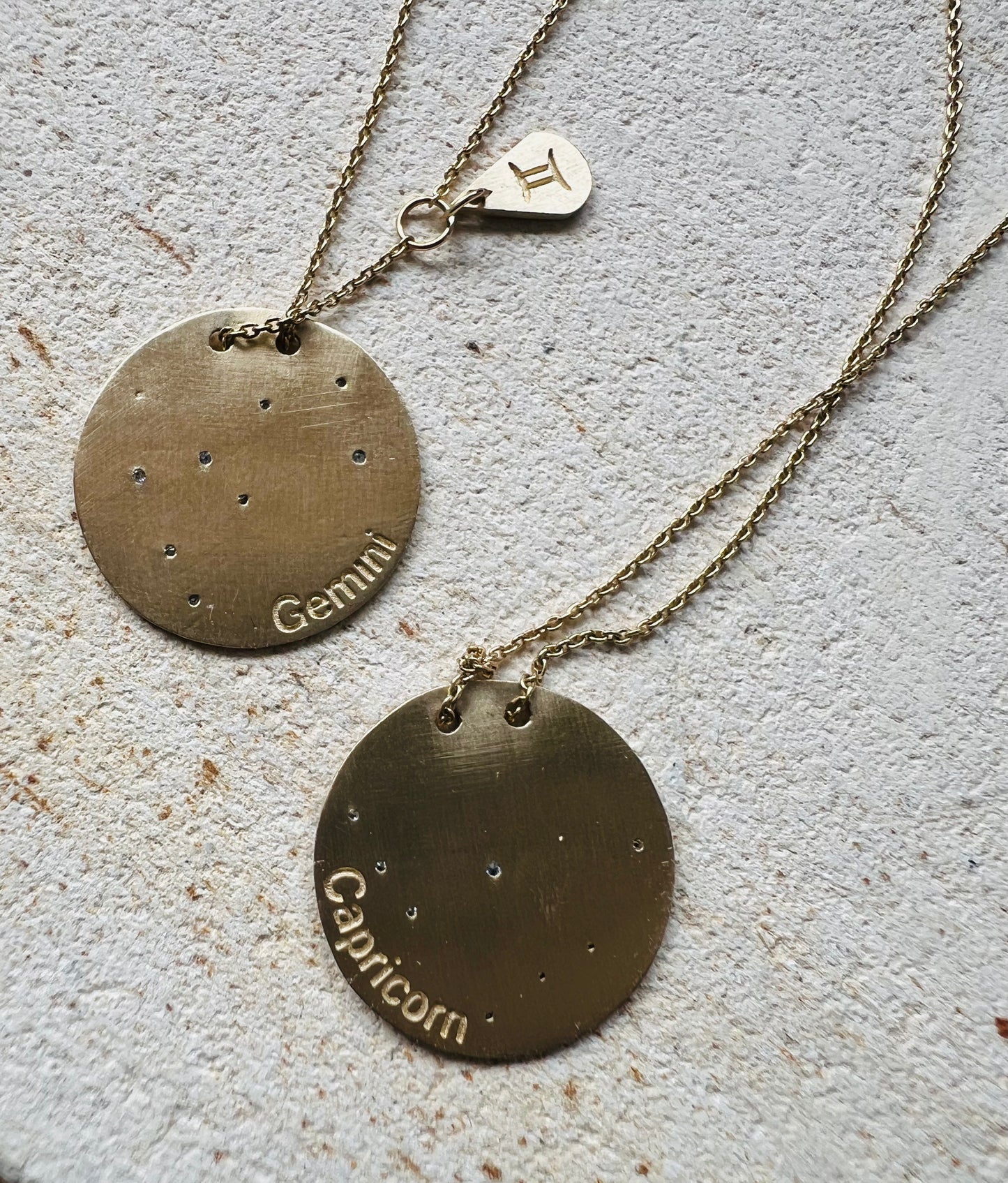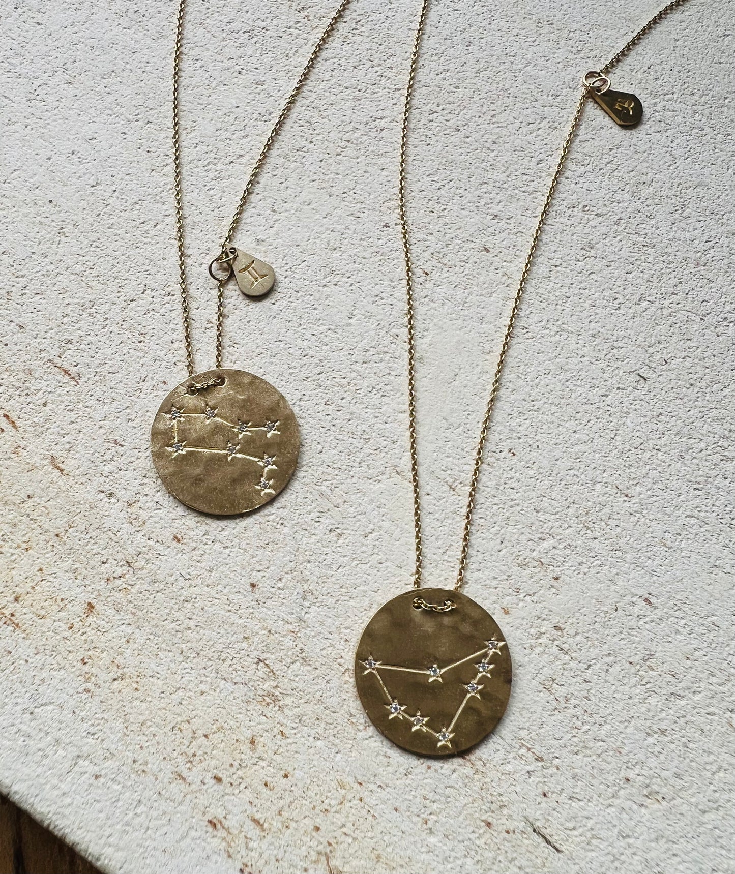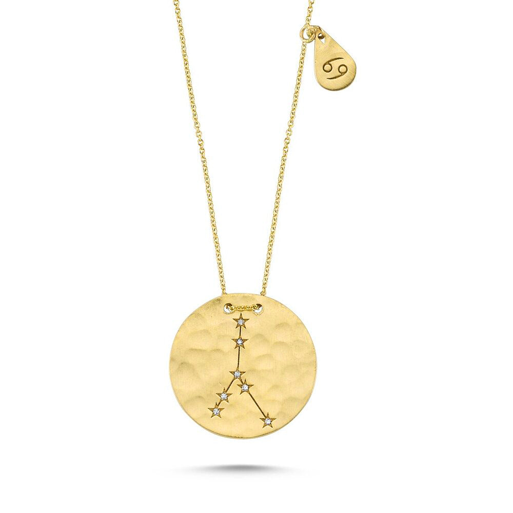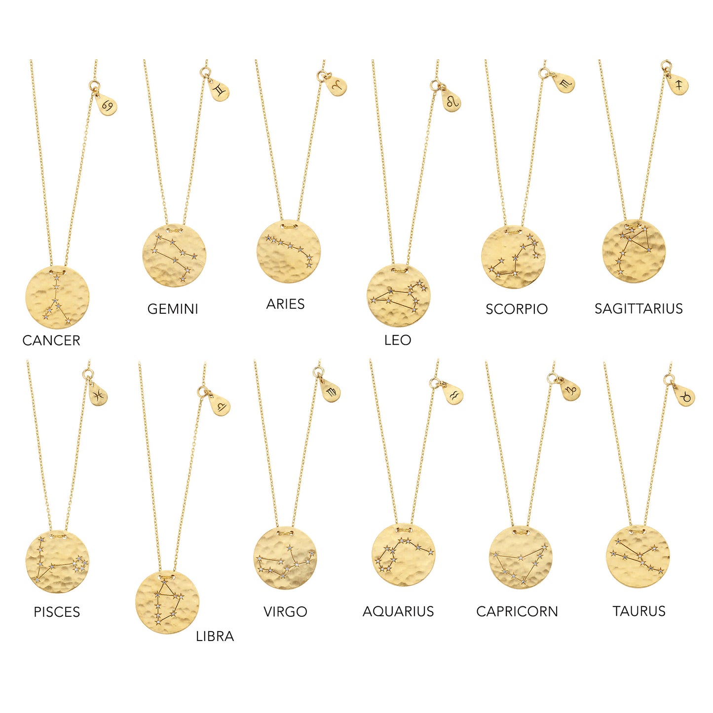 Indulge in celestial elegance with our handcrafted hammered 14K yellow gold zodiac pendants, each adorned with lab-grown diamonds, totaling 0.05 carats. Elevate your personal style by selecting your zodiac sign, meticulously crafted in Istanbul, where tradition meets innovation. Suspended delicately from a 16-inch chain, these pendants embody the timeless allure of the cosmos, capturing the essence of your astrological identity with unmatched sophistication and beauty.