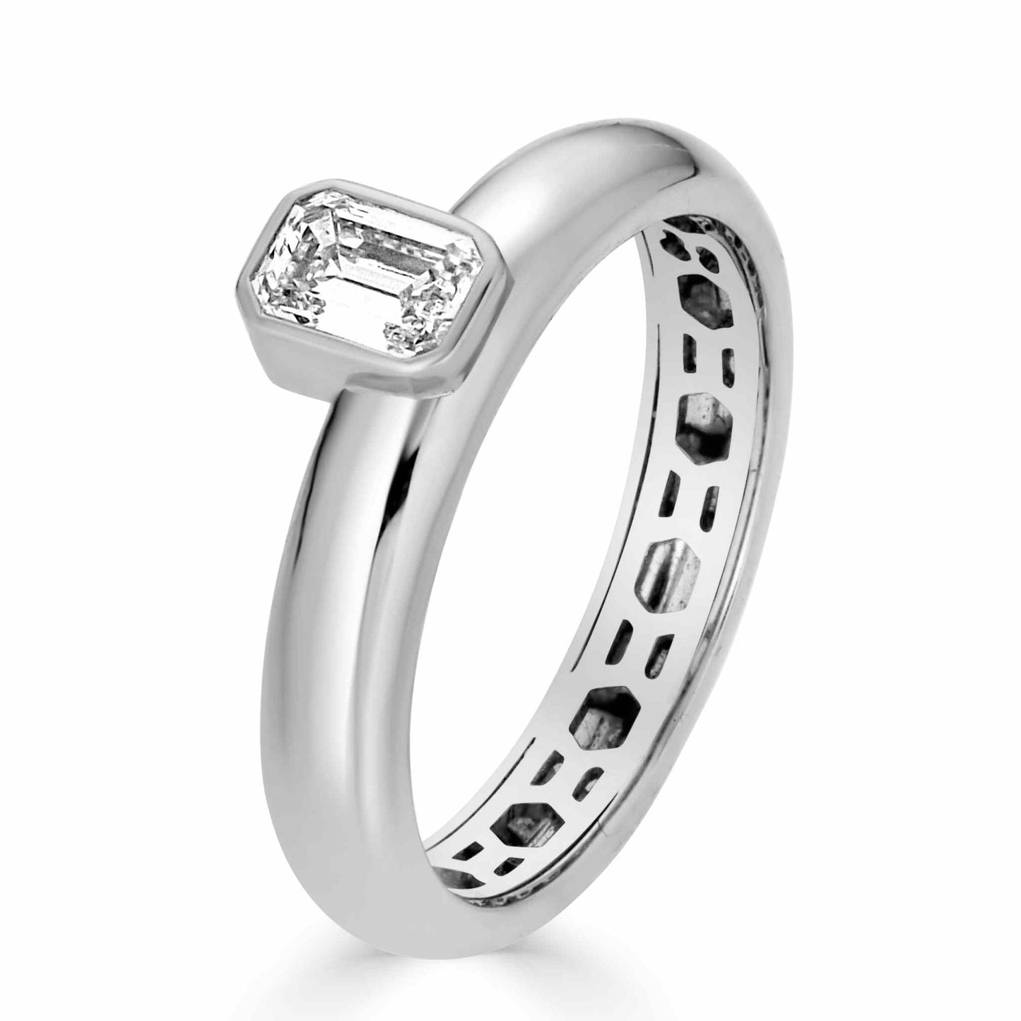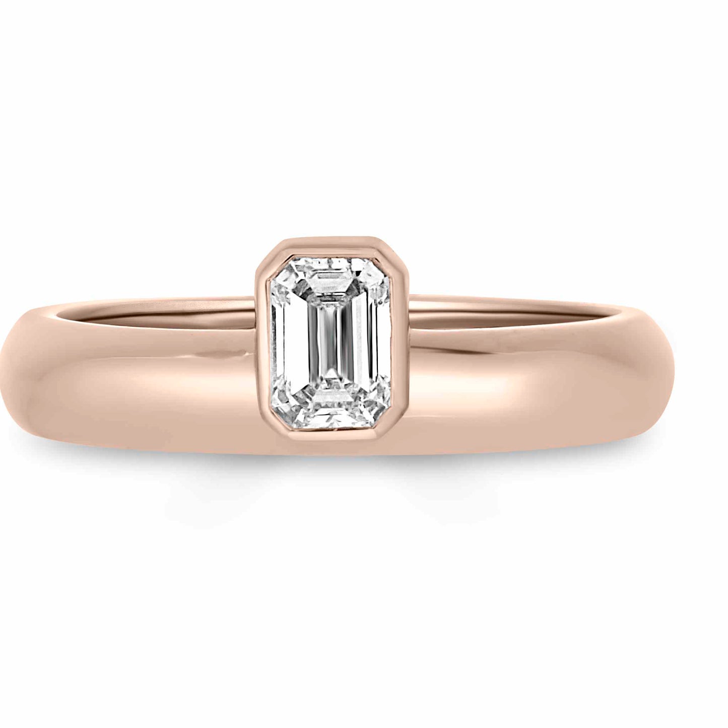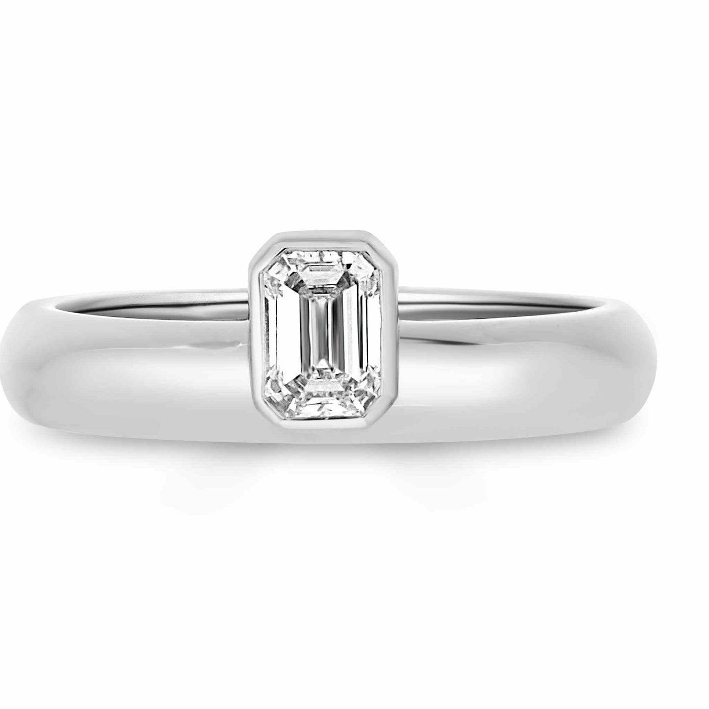 The Nadia Offset Emerald Cut Bezel Set Band in 14K Yellow Gold showcases a 0.5ct emerald-cut lab grown diamond in a striking offset bezel setting. The emerald cut’s step facets create a hall-of-mirrors effect, enhancing the diamond’s natural brilliance while maintaining a sleek and structured aesthetic. The offset design adds a contemporary twist, making this piece a modern statement of sophistication and individuality.