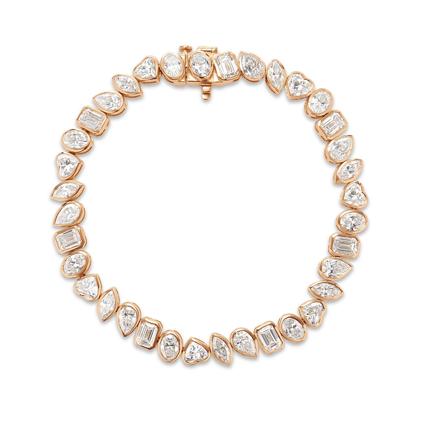 The Lucia North South Mixed Fancy Shape Bezel Set Tennis Bracelet is a captivating blend of modern elegance and timeless sophistication. Featuring 6.75ct of carefully selected mixed fancy-shaped lab grown diamonds, each stone is bezel-set in a distinctive north-south orientation, enhancing its brilliance and uniqueness. The combination of round, oval, and marquise cuts creates a dynamic yet harmonious design, making this bracelet a standout piece in any fine jewelry collection.