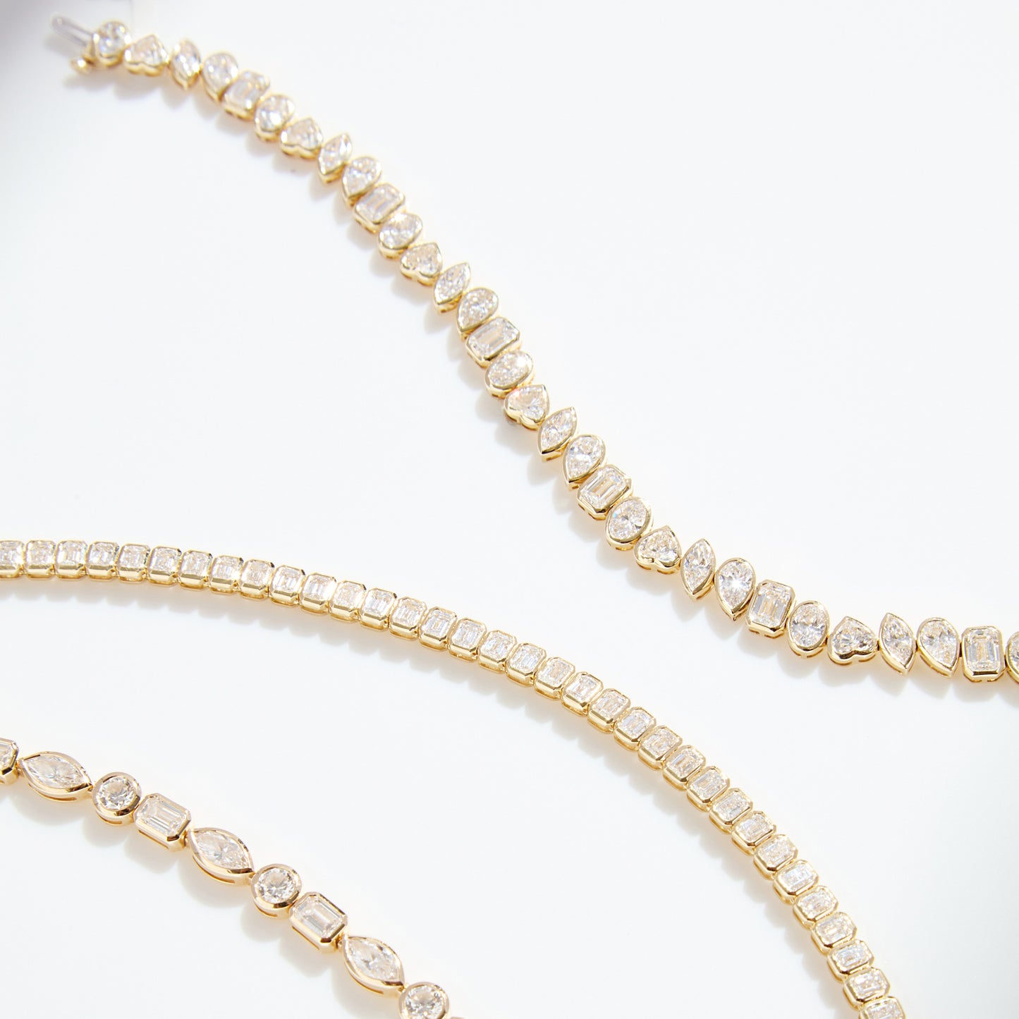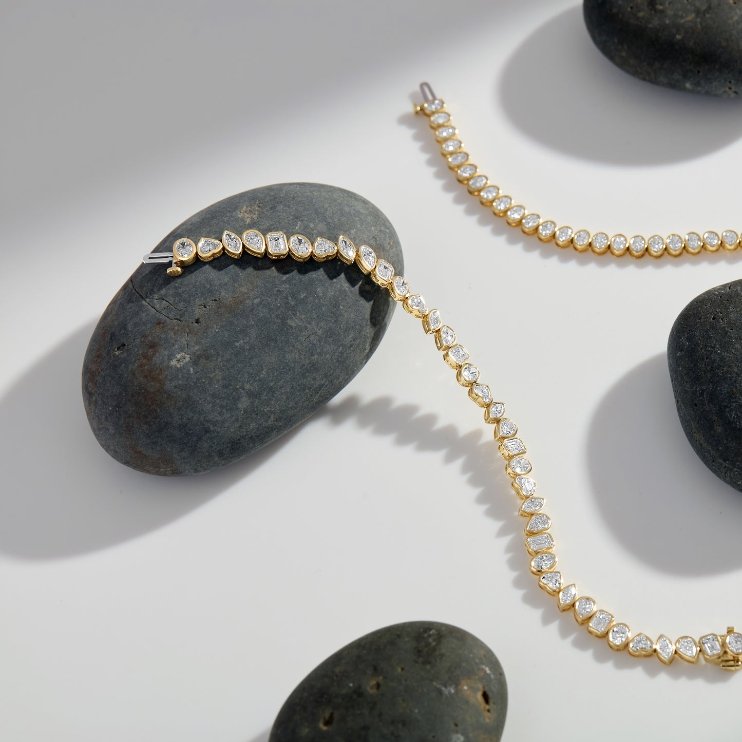 Introducing the "Lucia North South Mixed" Tennis Bracelet, a refined expression of brilliance with 6.75ct of mixed fancy-shaped lab grown diamonds, bezel-set in a striking north-south orientation in 14K Yellow Gold.