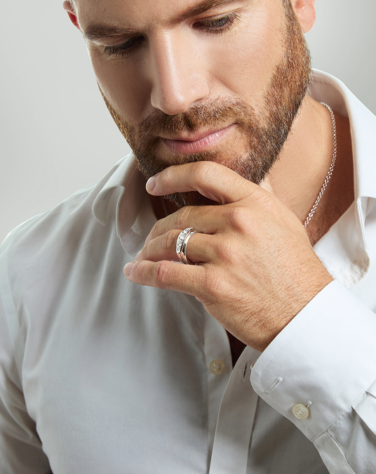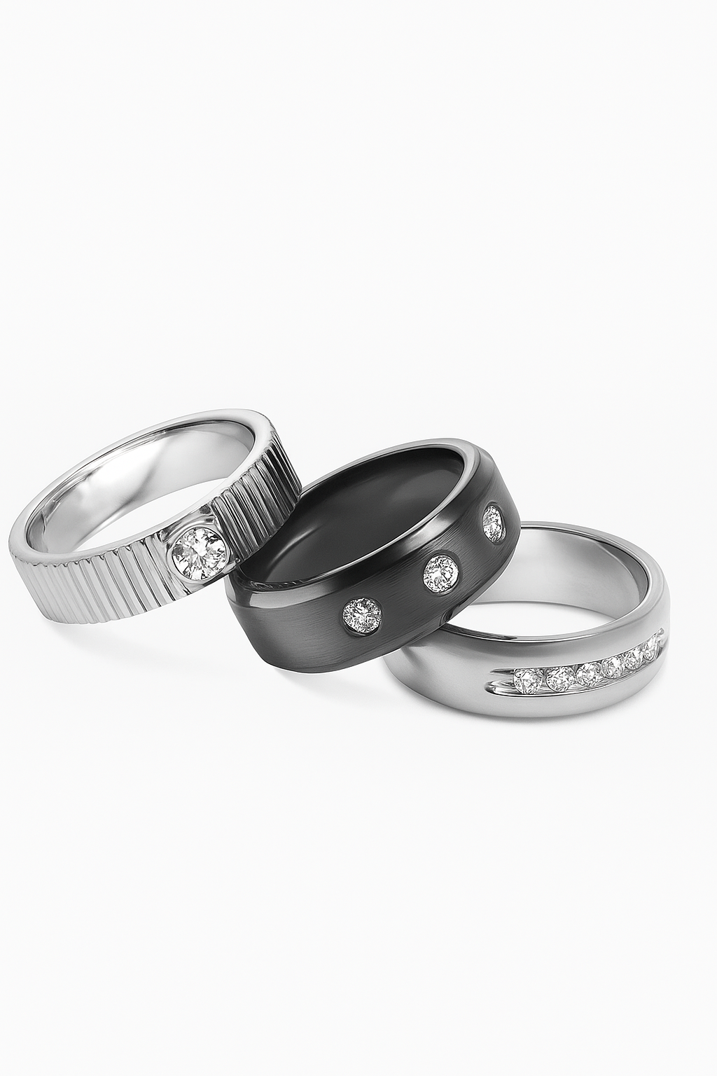 Men's rings and wedding bands that combine bold design with timeless craftsmanship. For the ones who wear their commitment with confidence and style.