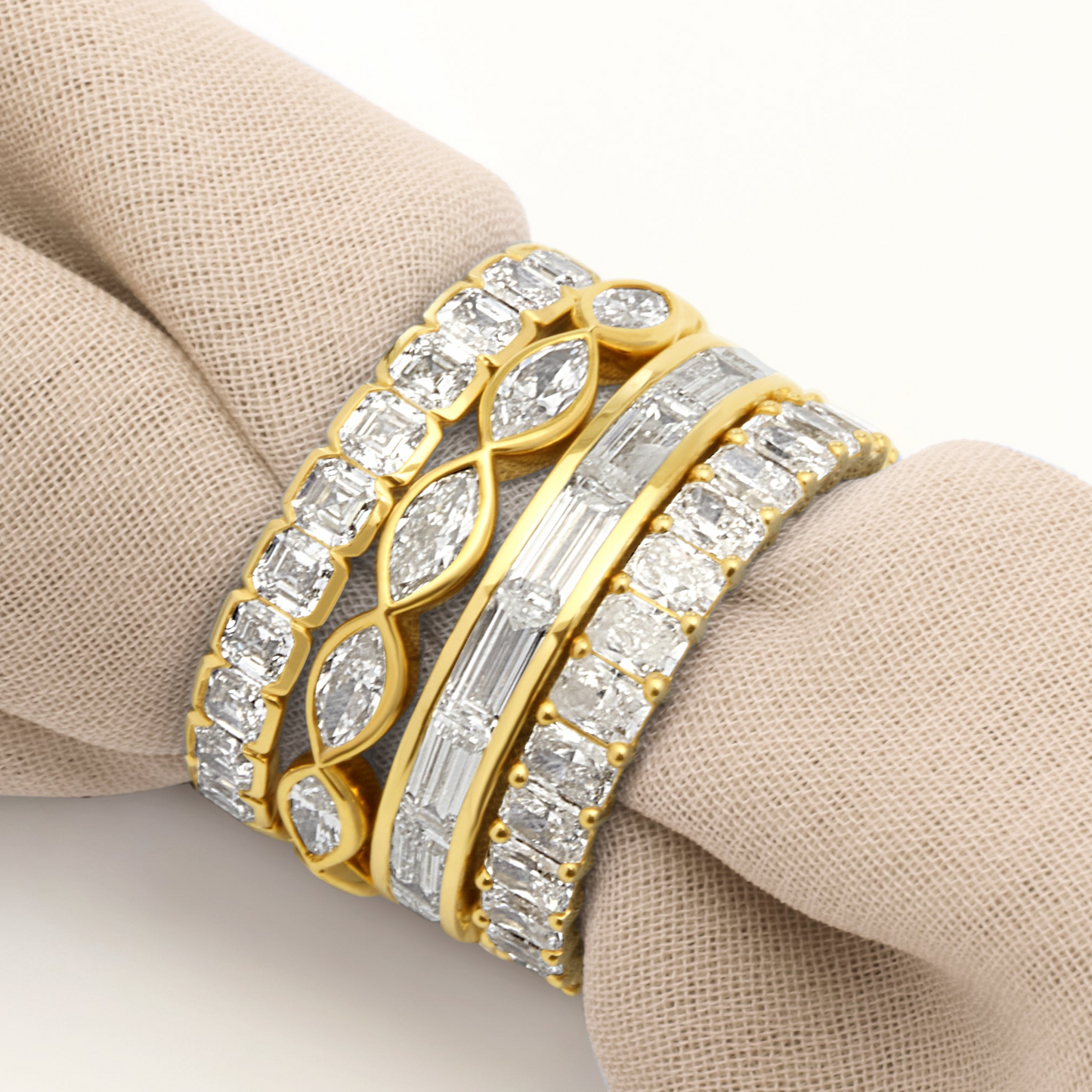 Discover the beauty of contrast and composition. Mix and match our fancy-shaped wedding bands to curate a stack that reflects your style—unique as your love, and the perfect way to say “I do.”