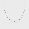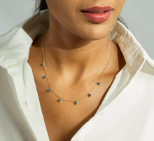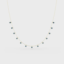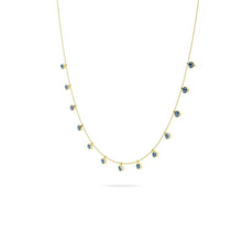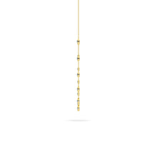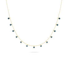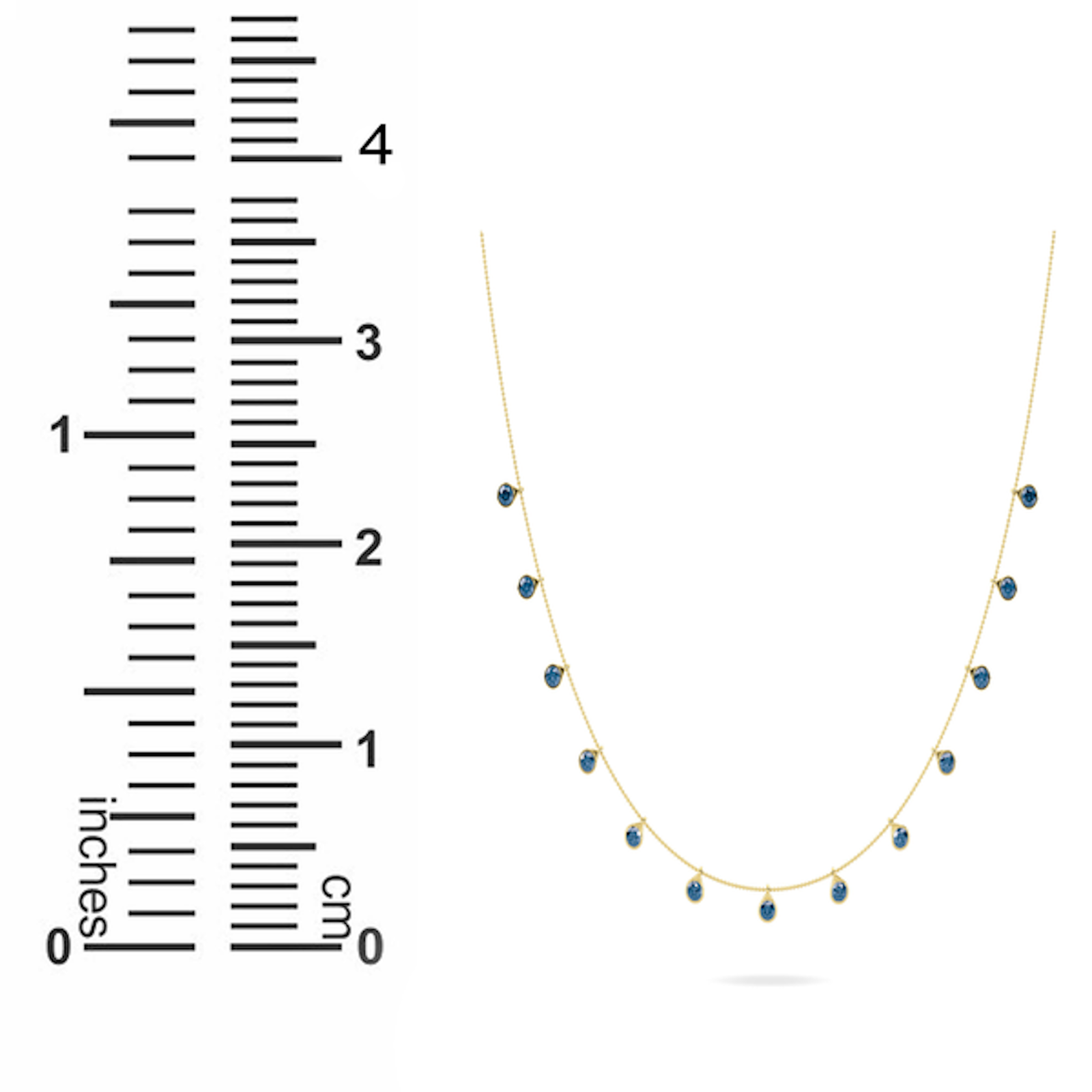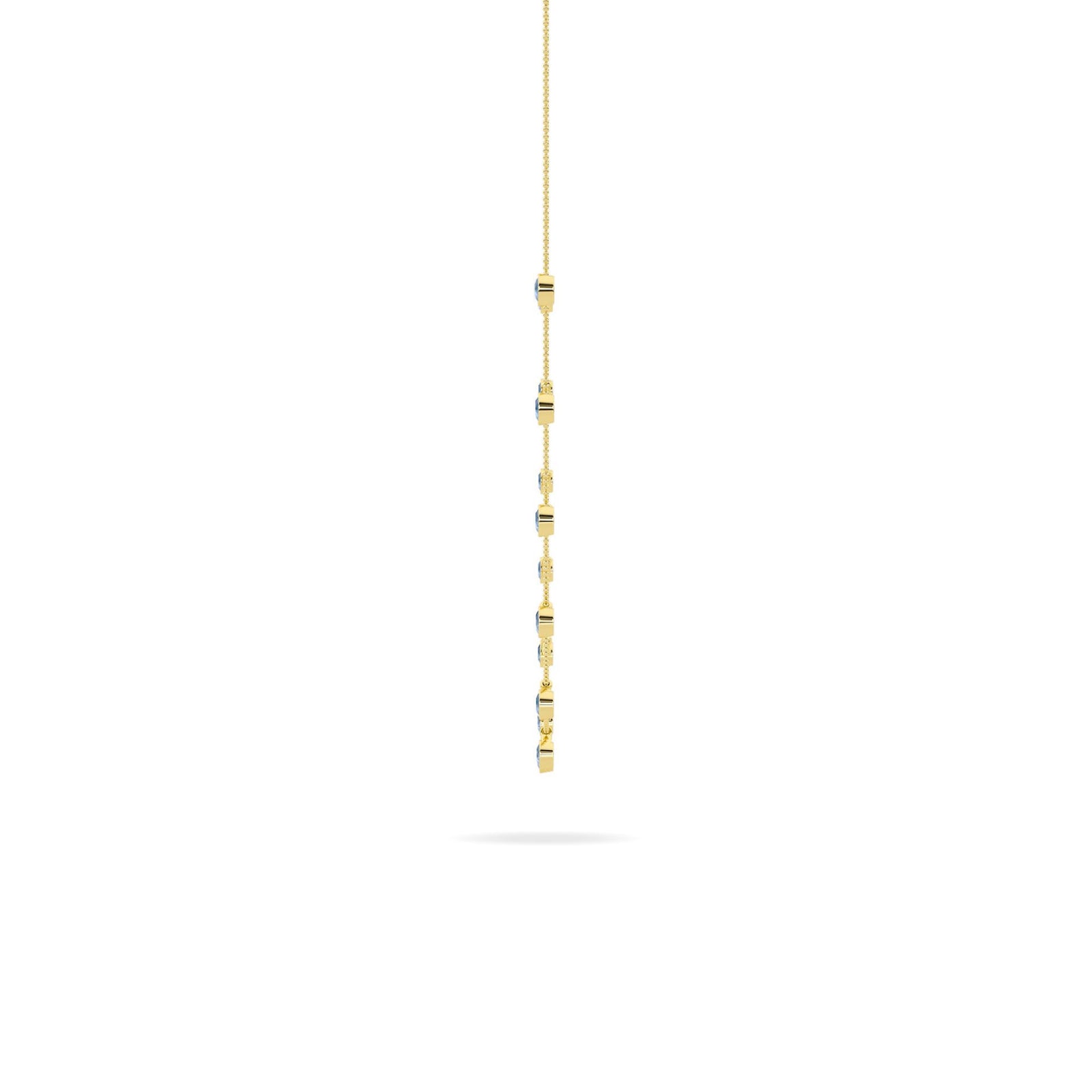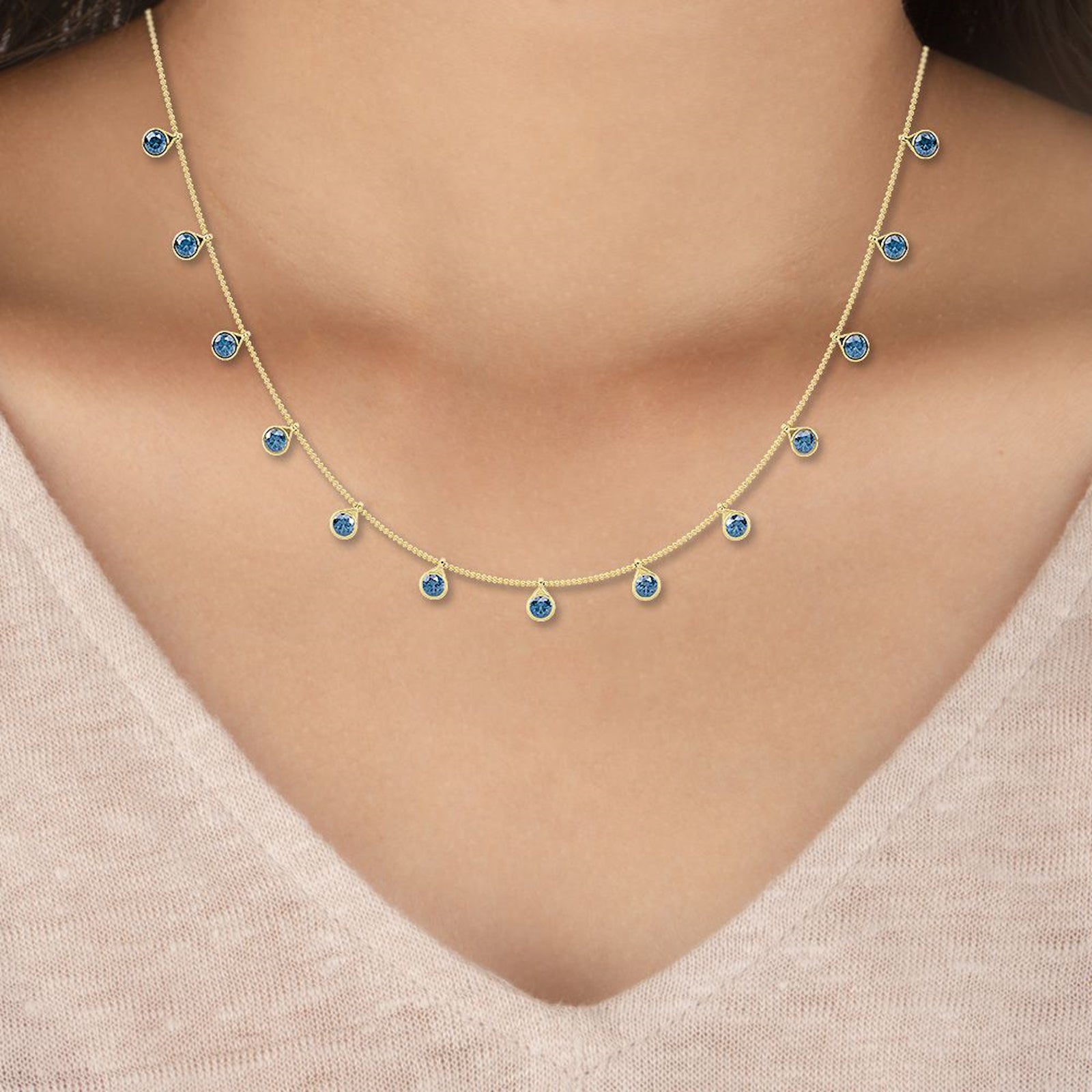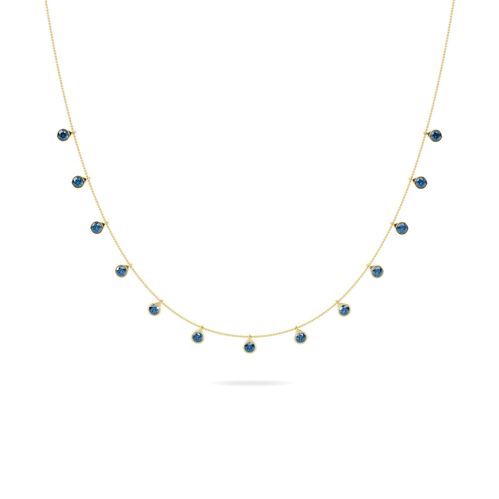 Thirteen bezel-set blue lab-grown diamonds (3.70mm each, 2.76cttw) are suspended along a faceted mirror chain in 14K yellow gold—designed to catch the light with every step. The soft rhythm of the drops paired with the luminous chain creates a fluid, effortless silhouette made to layer or stand alone.