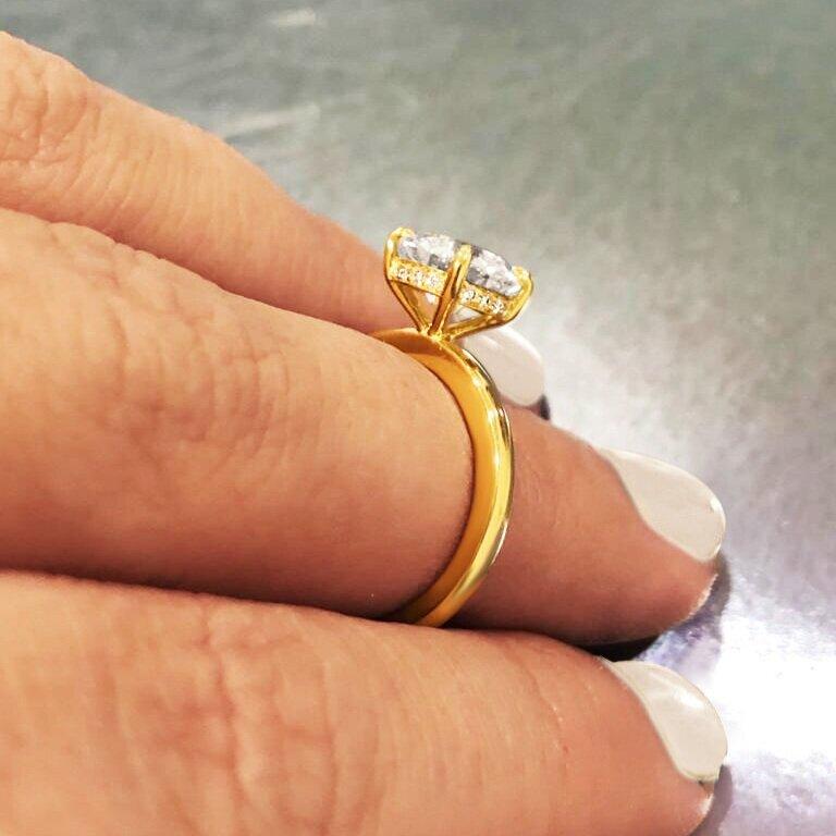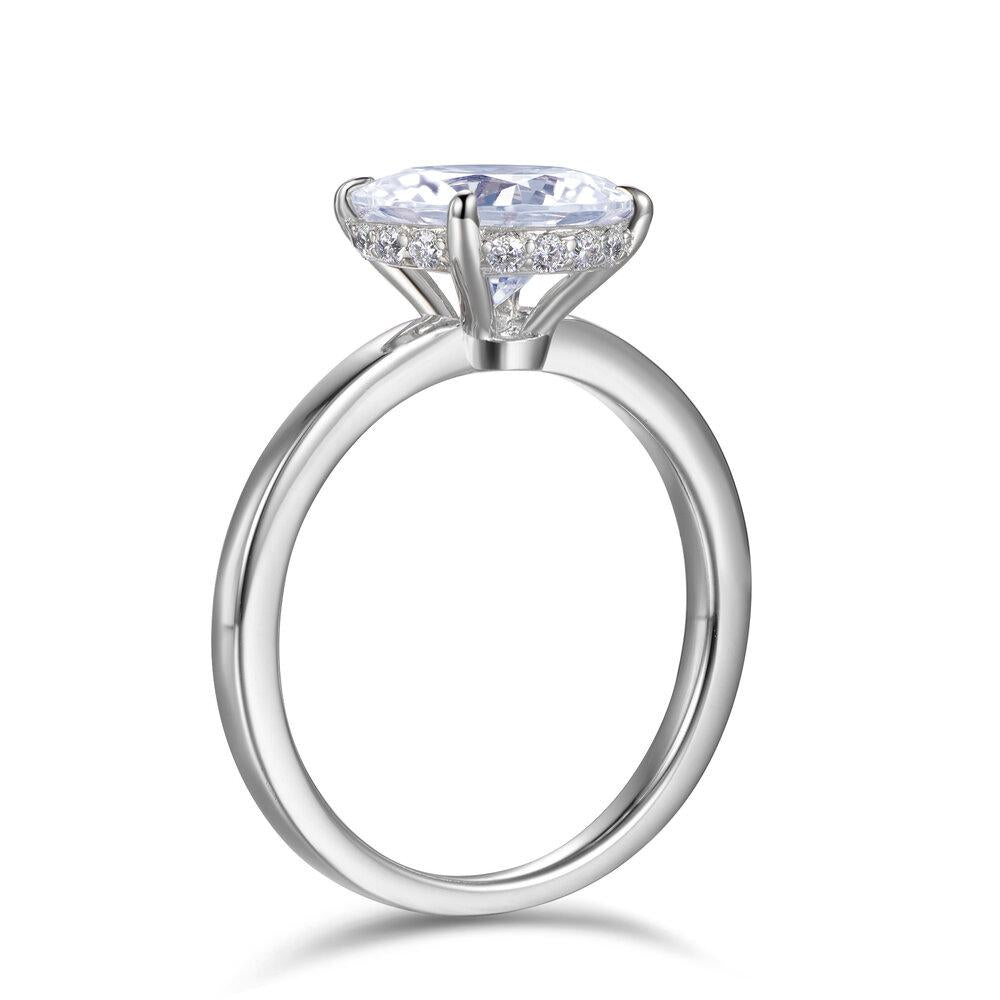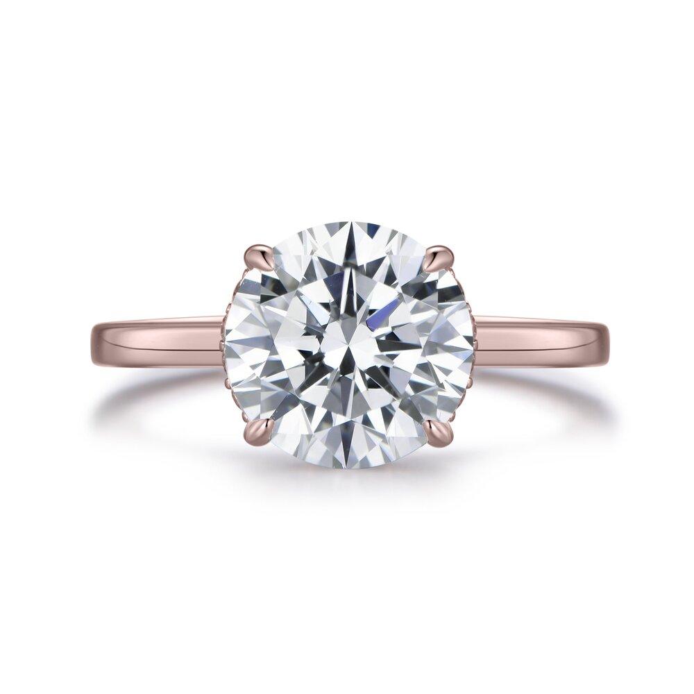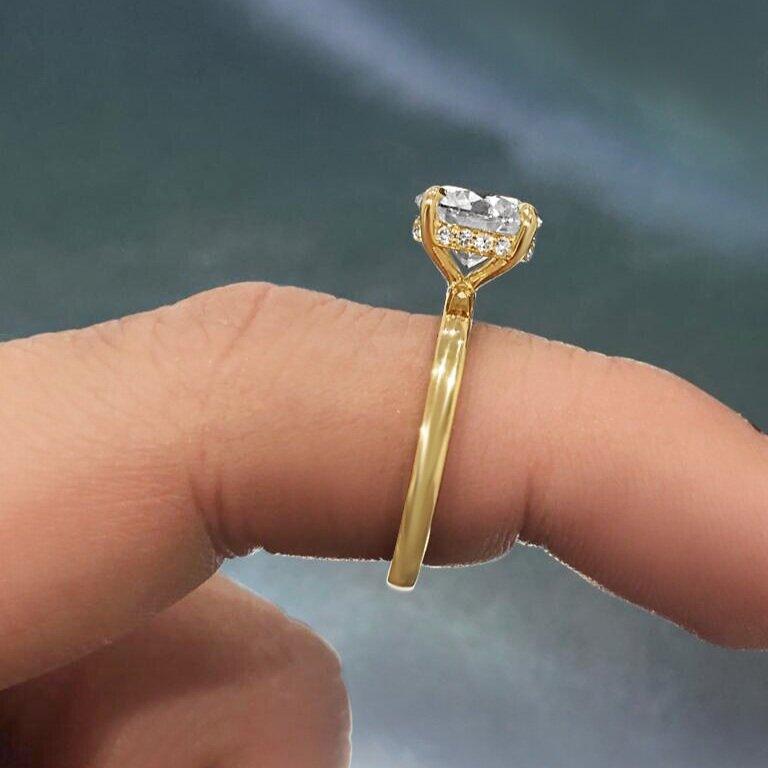 Introducing the Lumeniri Hidden Halo Solitaire Collection. A modern twist on a classic favourite. This hidden halo solitaire engagement ring features a magnificent central stone with discreetly hidden bead set lab diamonds that form a halo thus adding a discreet touch that is only visible to the wearer. Four handcrafted and ultra-precise "tiger claws" hug the center stone. Available in round cut, emerald, Asscher, Princess, cushion, radiant, oval cut, and pear shape, each diamond is carefully curated in laboratory conditions, while keeping true to the Labyrinth core values.